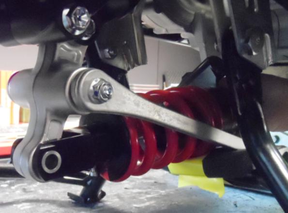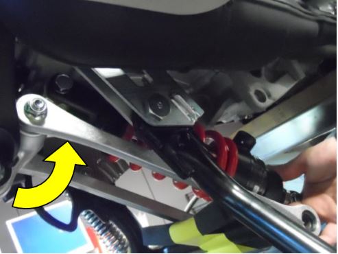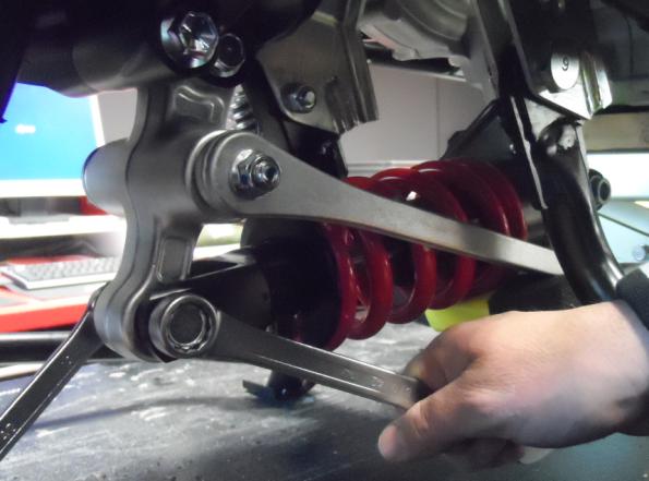 - Posizionare l’attacco superiore dell’ammortizzatore tra le biellette del link, portare il tutto in prossimità dell’attacco a telaio, inserire la boccola di guida e serrare il tutto con dado e bullone originale.
