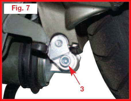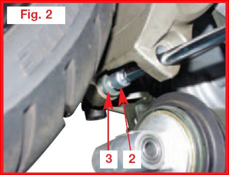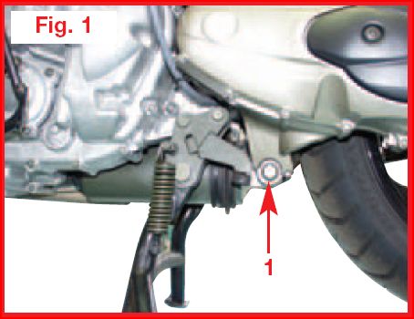 - Svitare la vite di 12 mm che fissa l’ammortizzatore al forcellone della ruota posteriore (Fig. 1).